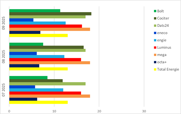 Les résultats présentés dans les graphes ci-dessous portent sur le 3e trimestre 2025. L'ensemble des graphes sont repris dans un fichier global: Rapport concernant les indicateurs de performance des fournisseurs d’électricité et de gaz relatifs au 3e trimestre 2025 (= document renouvelé régulièrement).