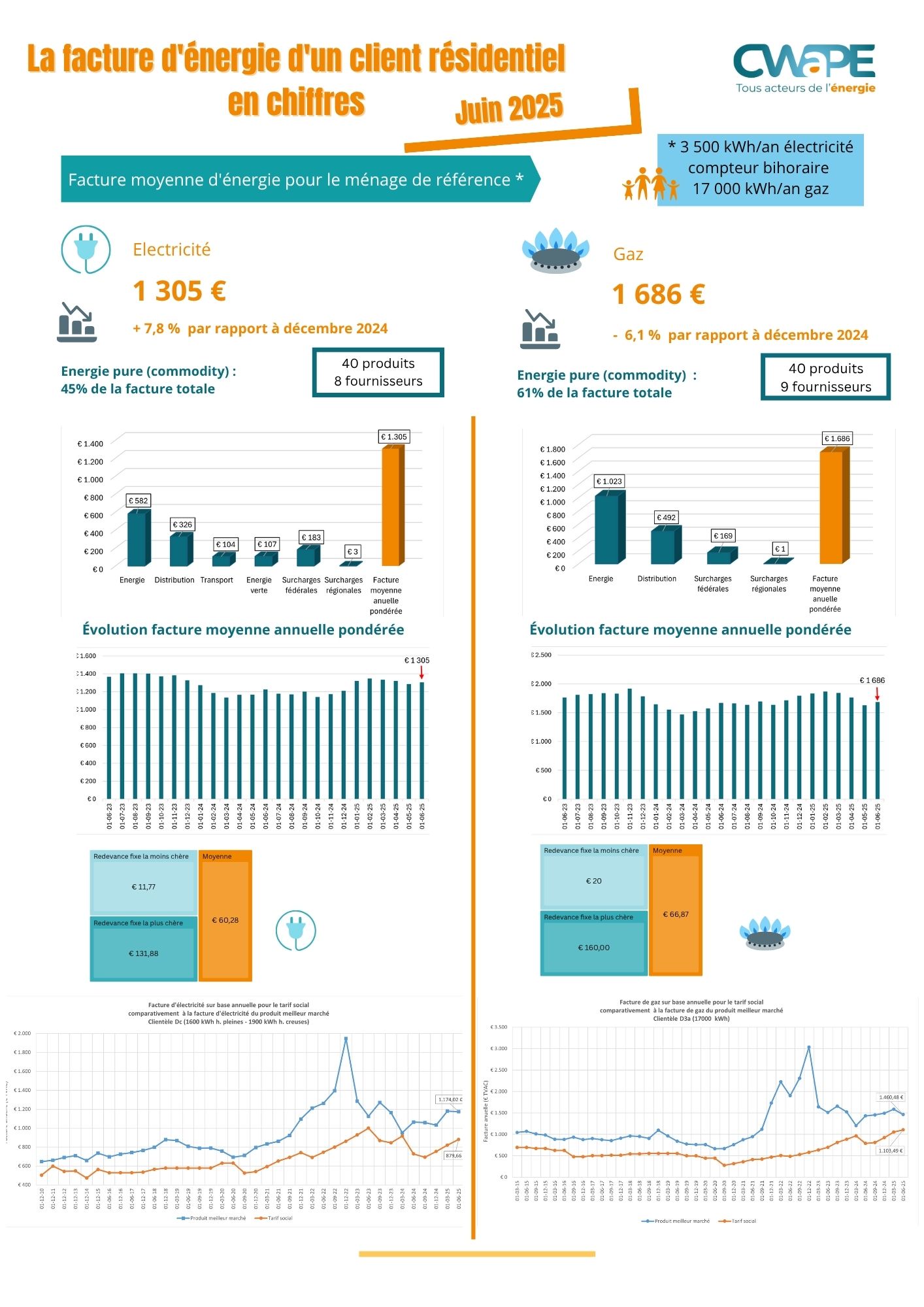 Im Juni 2025 betrug die durchschnittliche Jahresrechnung eines Haushaltskunden in der Wallonie [1] 1305 € für Strom für den Kundentyp Dc und 1686 € für Gas für den Kundentyp D3a.