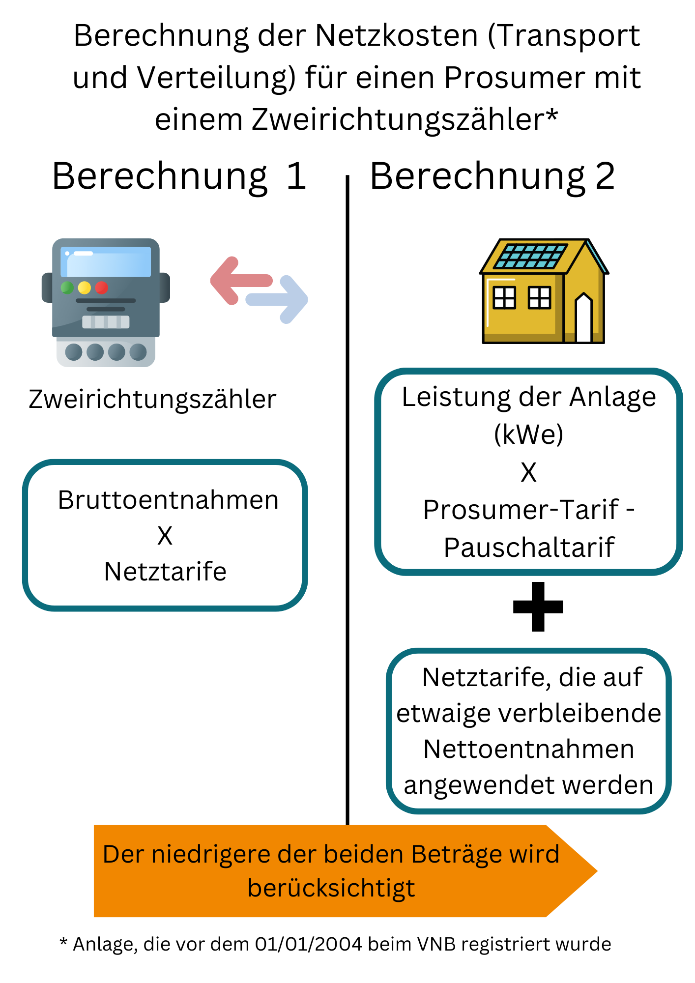 Die CWaPE hat ermittelt, dass im Allgemeinen 37,76 % der erzeugten Energie gleichzeitig verbraucht werden. 62,24 % der erzeugten Energie werden in Folge in das Netz wieder eingespeist und zu einem anderen Zeitpunkt verbraucht. Der Prosumer-Tarif besteht daher darin, den Prosumer an den Netzkosten bei einer Höhe von 62,24 % dessen, was ein herkömmlicher Netzbenutzer gezahlt hätte, für die Verteilungs- und Transportkomponenten (einschließlich diesbezüglicher Zuschläge) für einen vergleichbaren Stromverbrauch.