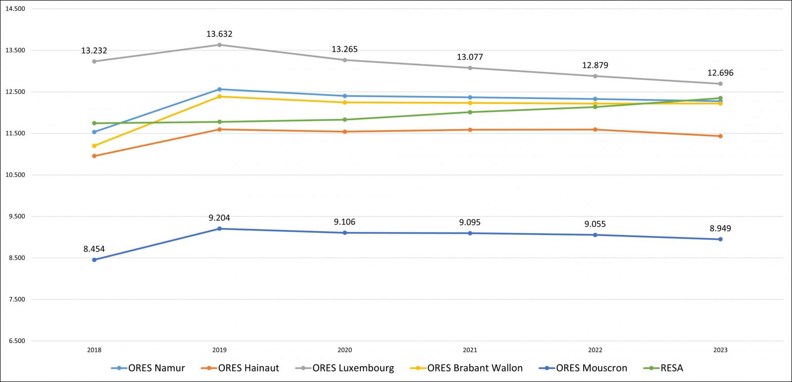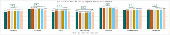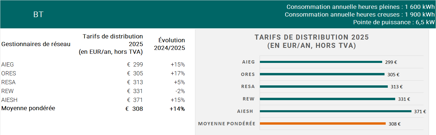Le tarif prosumer capacitaire (facturé aux prosumers qui ne disposent pas d’un compteur communicant) connait des évolutions différentes d’un GRD à l’autre entre 2024 et 2025. Le fait que le tarif prosumer présente une hausse proportionnellement plus importante que la hausse du seul tarif de distribution provient du fait que le tarif de transport (inclus dans le tarif prosumer) augmente fortement entre 2024 et 2025.