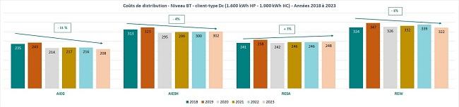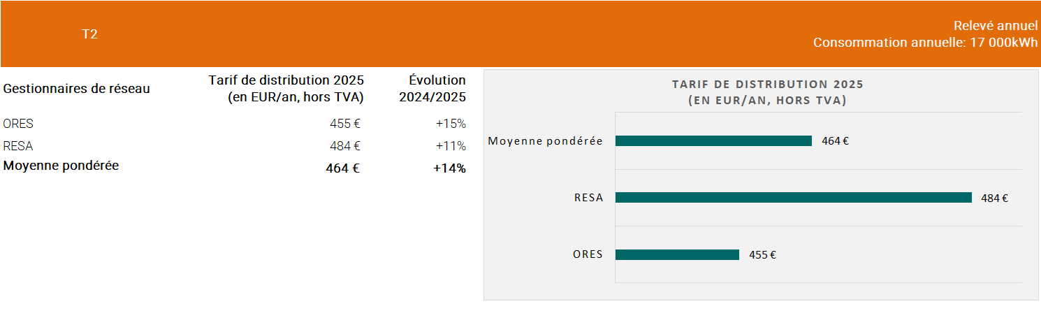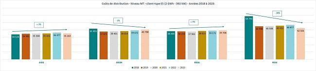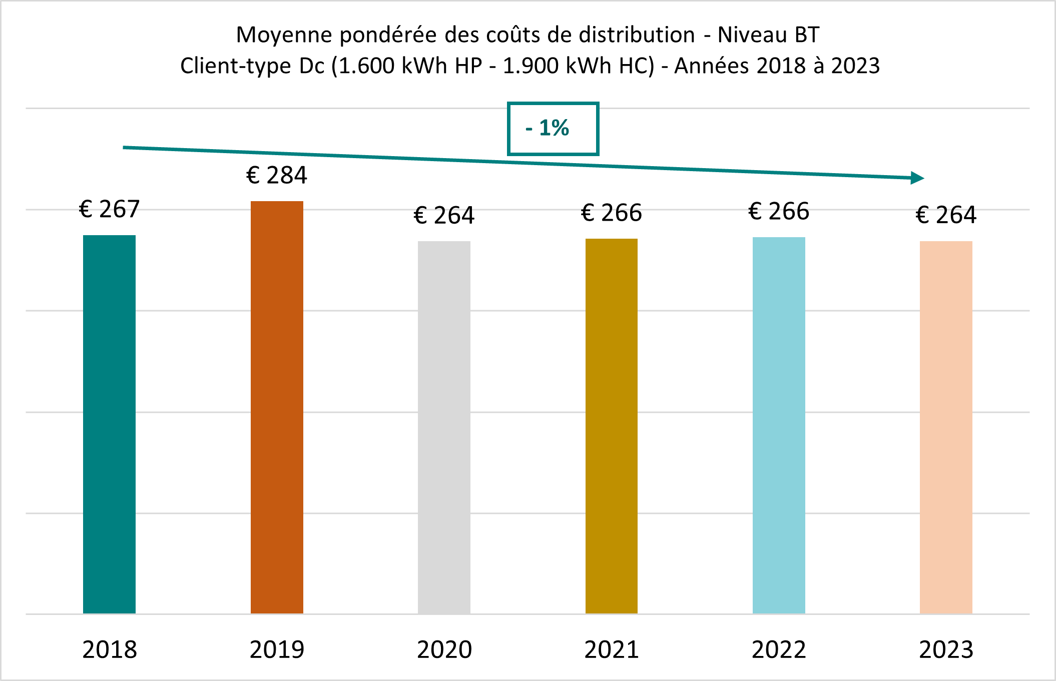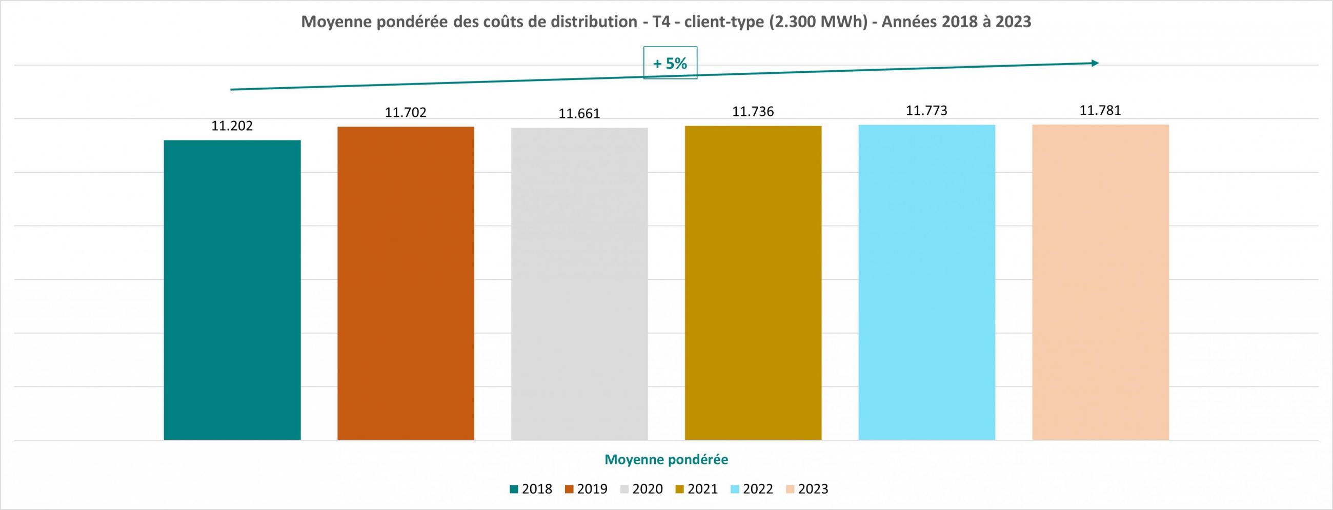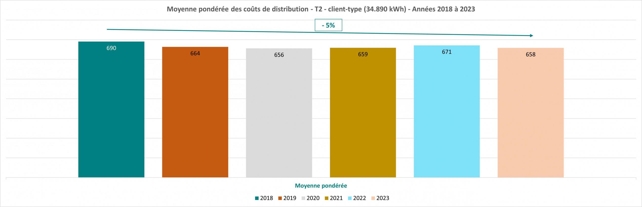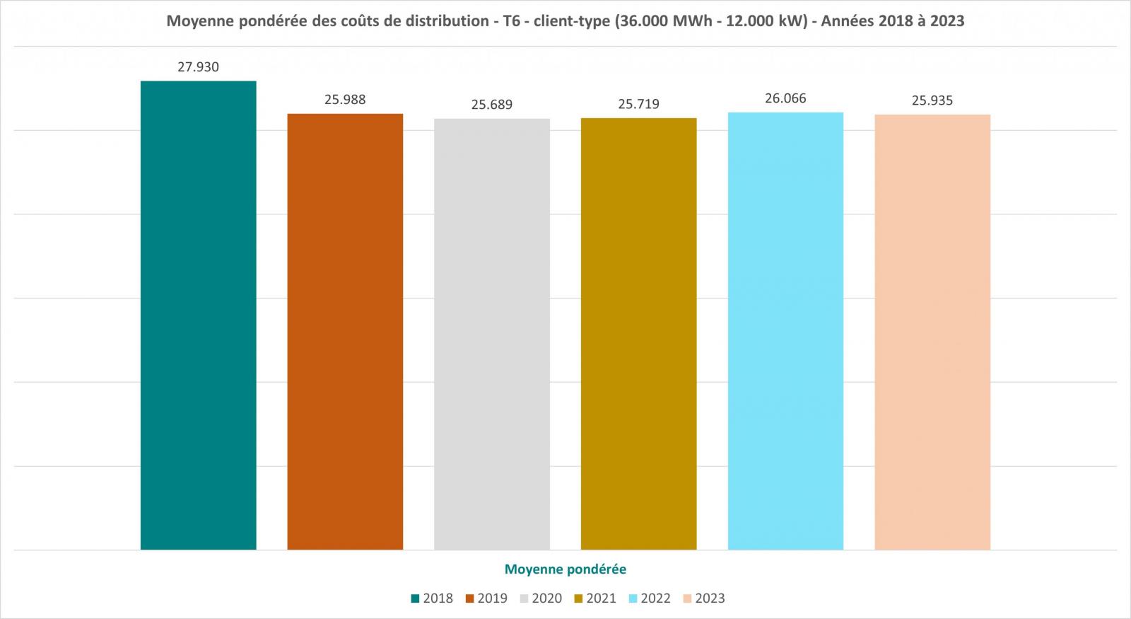 Le graphique ci-dessous présente la moyenne pondérée des coûts de distribution (client type T2) de 2020 à 2025.