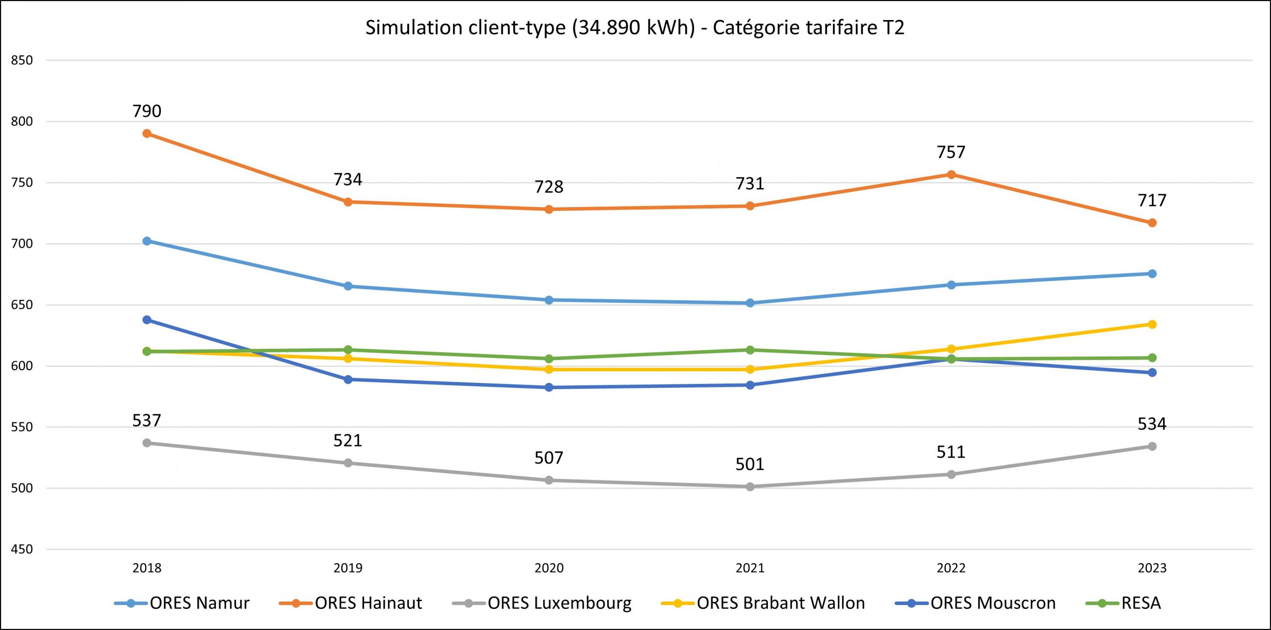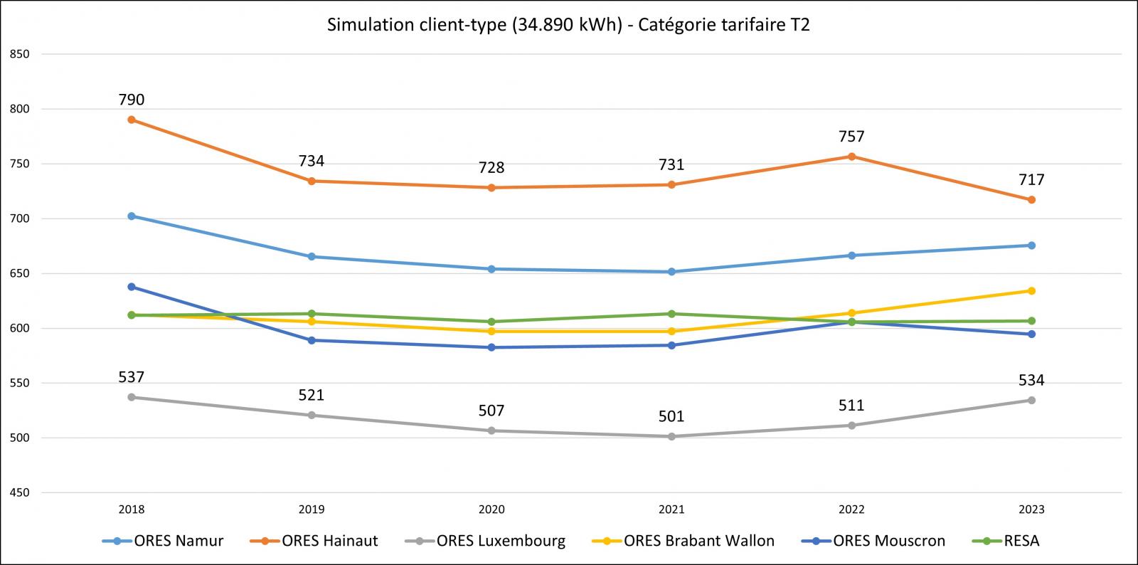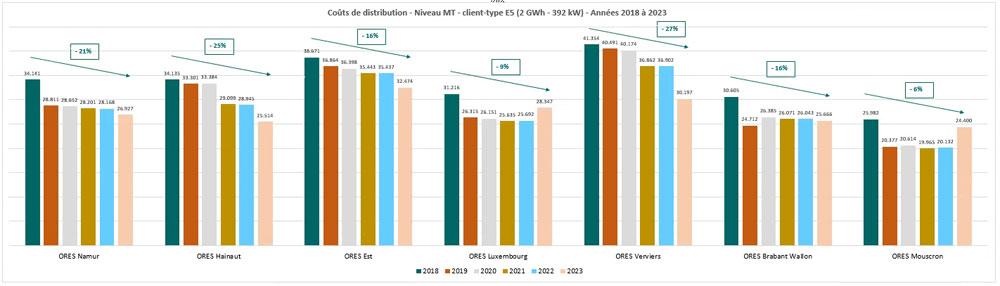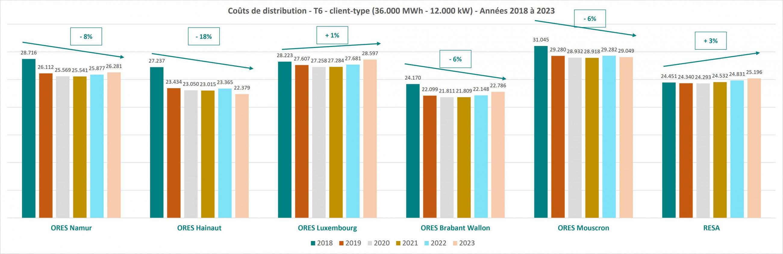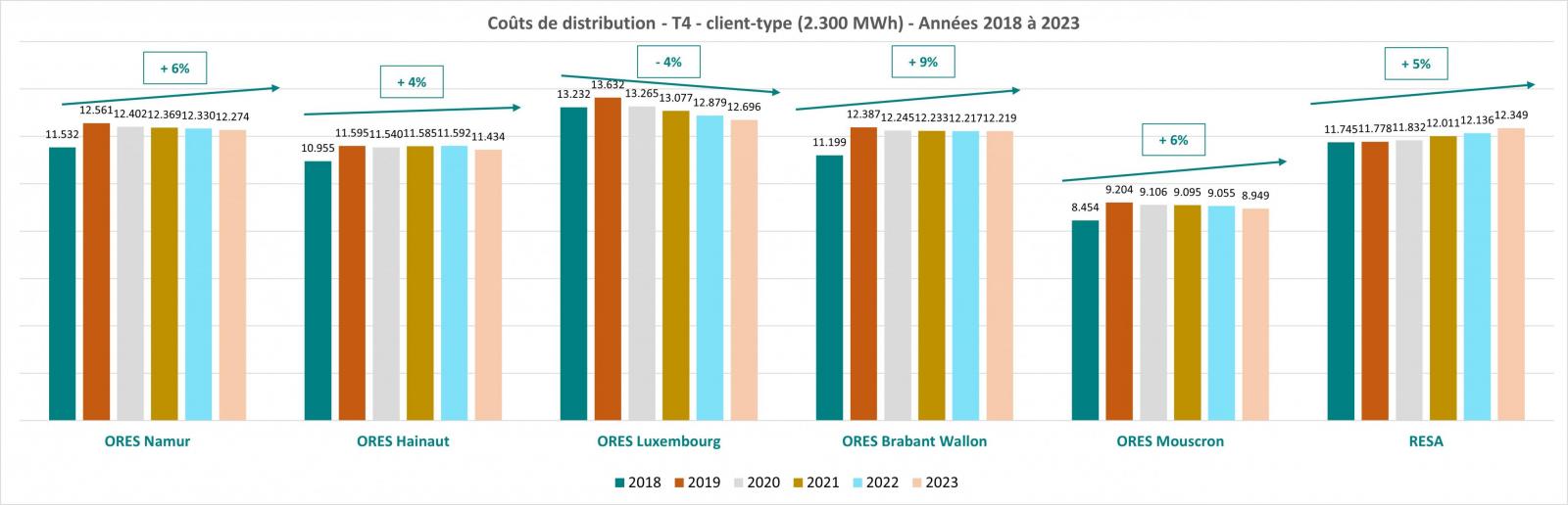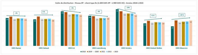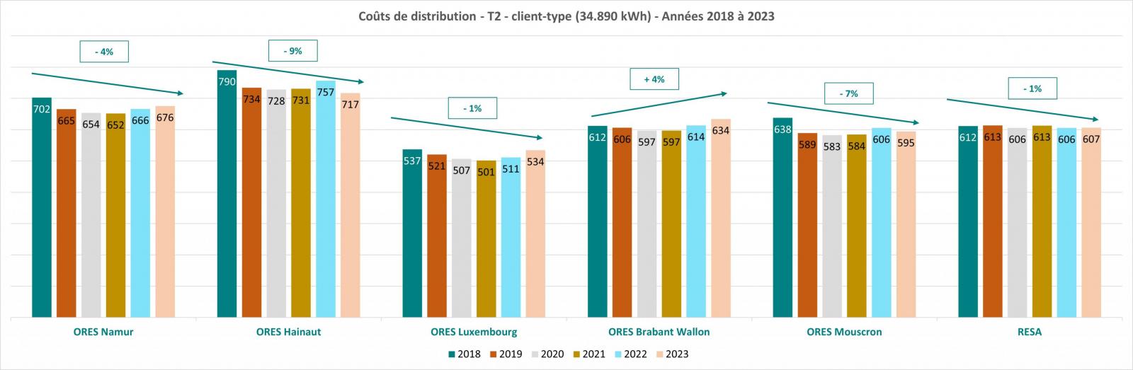 Le graphique ci-dessous présente la moyenne pondérée des coûts de distribution (client type T2) de 2020 à 2025.
