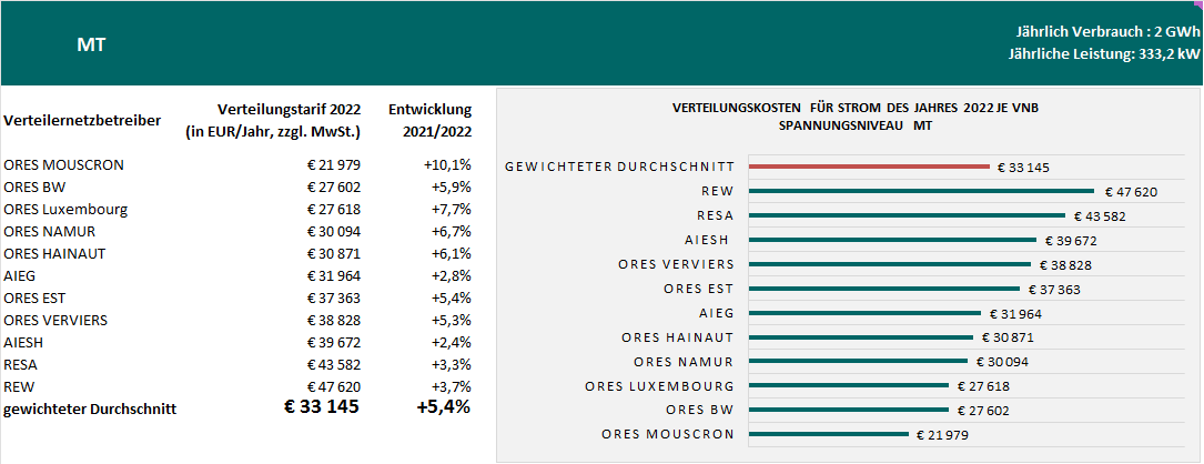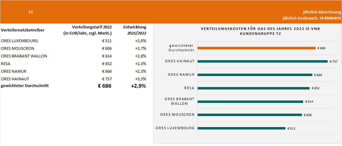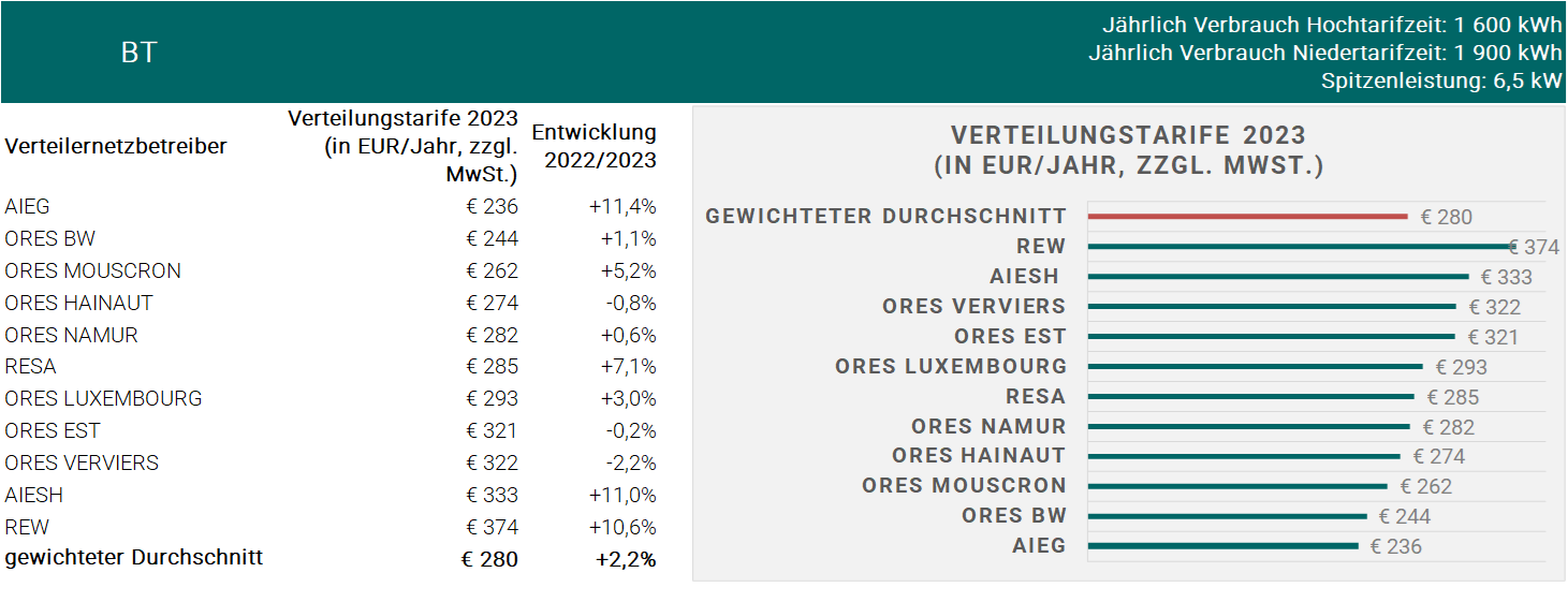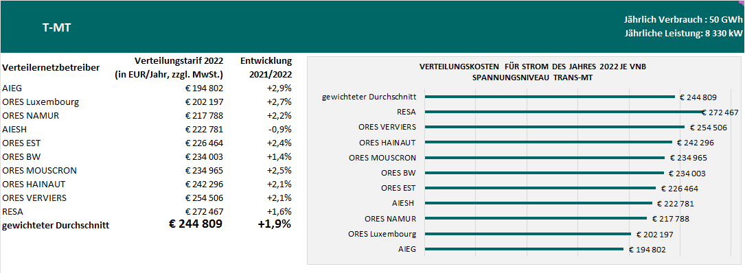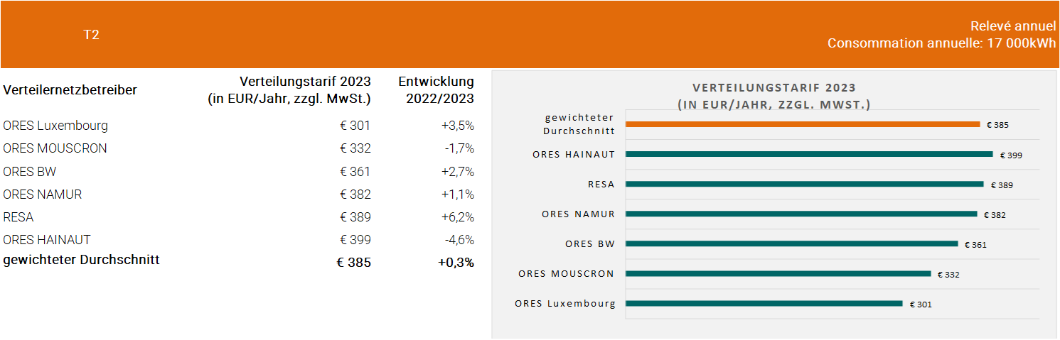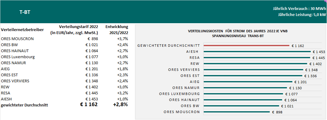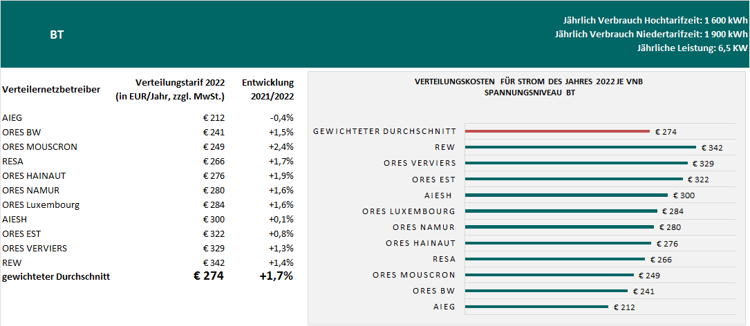 Die Verteilertarife werden von den Netzbetreibern vorgeschlagen und von der CWaPE mit den Tarifentscheidungen genehmigt. Die Entscheidungen der CWaPE in Bezug auf die geltenden Tarife (2025-2029) sind in der Rubrik „Tarifentscheidungen“ verfügbar.