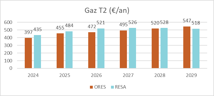 Pour les clients résidentiels, les coûts de distribution de gaz évoluent à la hausse pour ORES et pour RESA entre 2024 et 2025.