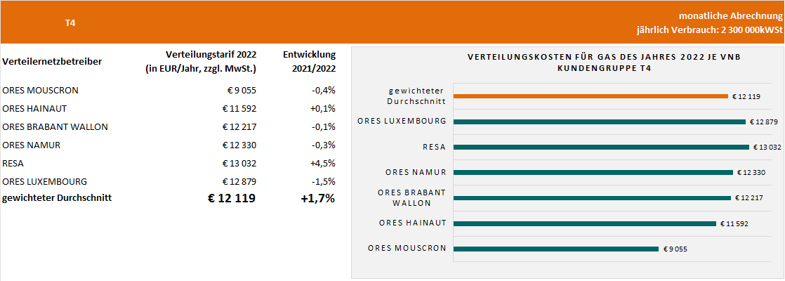 Die Verteilertarife sind in zwei Kategorien unterteilt: periodische Tarife und nicht periodische Tarife. Die periodischen Tarife werden dem Abnehmer mit der Rechnung seines Lieferanten in Rechnung gestellt. Die von der CWaPE genehmigten periodischen Verteilertarife gelten für die Entnahme und Einspeisung von Gas und Strom in der Wallonischen Region.