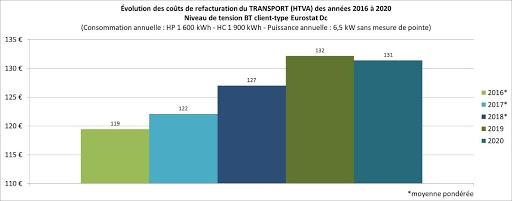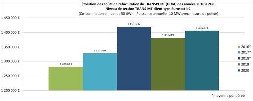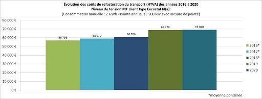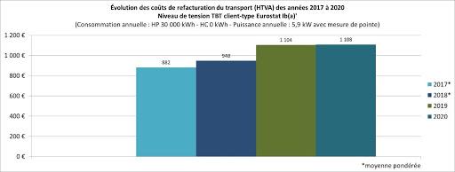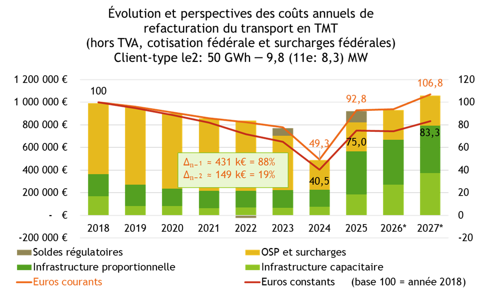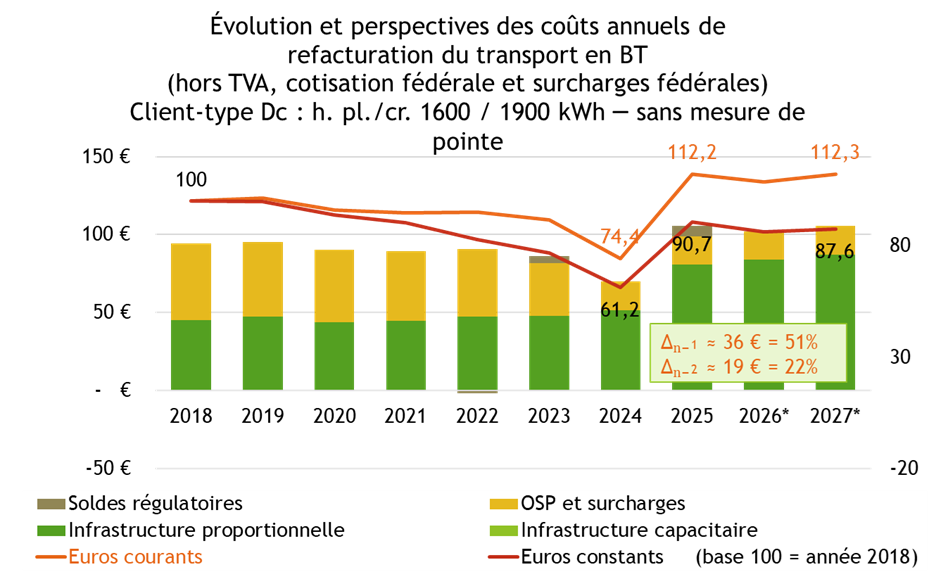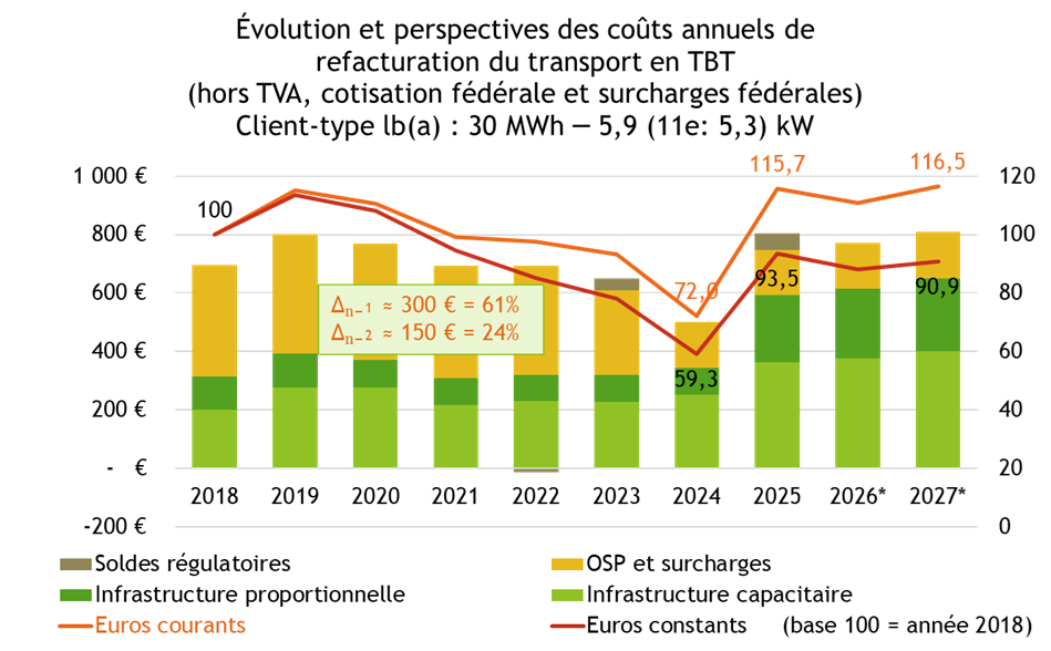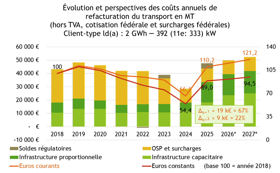 Les coûts de refacturation des charges d’utilisation du réseau de transport augmentent de manière substantielle entre 2024 et 2025 pour les différents niveaux de tension. Cette augmentation a pour origine l’approbation par le régulateur fédéral des tarifs de transport du gestionnaire du réseau de transport d’électricité sur la période 2024-2027.