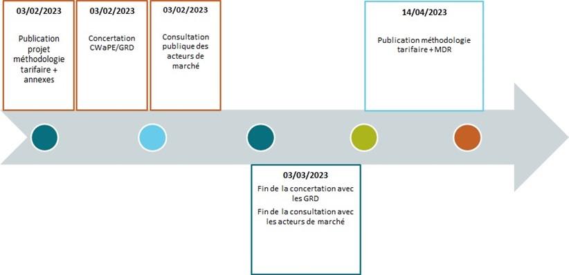 Le projet de méthodologie tarifaire 2024 a été soumis du 3 février 2023 au 3 mars 2023 à concertation avec les GRD et à consultation publique.