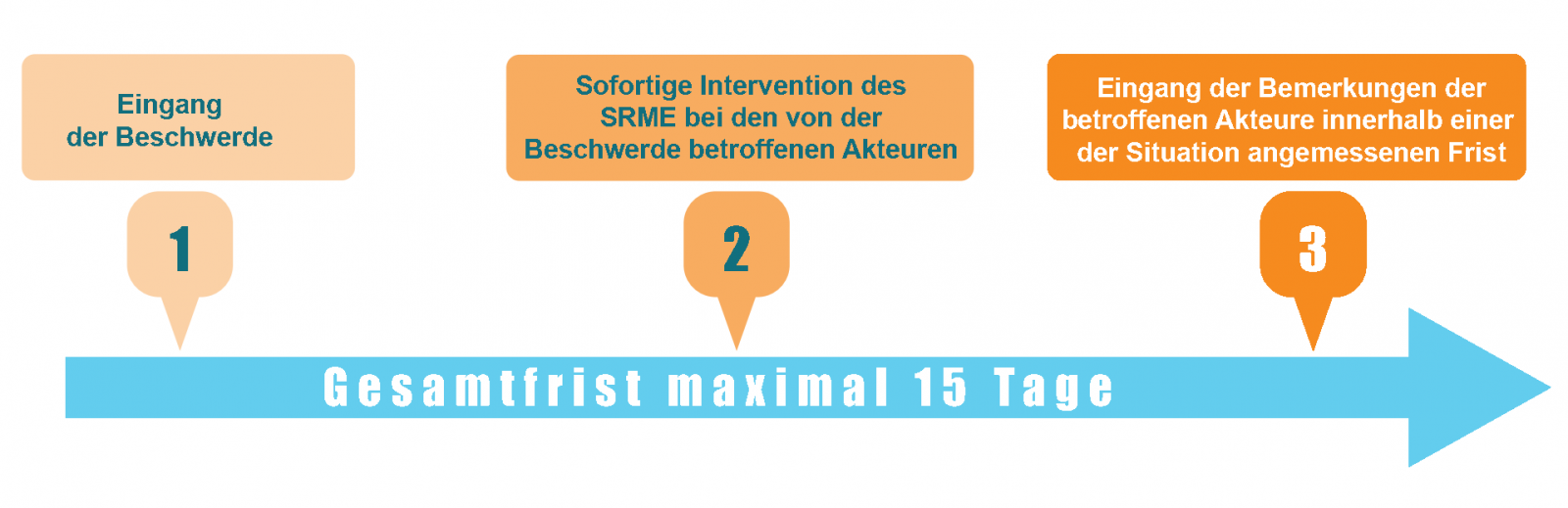 Nach der Untersuchung der Klagepunkte des Beschwerdeführers und der Möglichkeit für die Gegenseite, ihre Beobachtungen einzubringen, erklärt der SRME die Beschwerde für begründet, teilweise begründet oder unbegründet. Er begründet seine Position. Wenn die Beschwerde (teilweise) begründet ist, beschreibt der SRME die für den Streitfall vorgeschlagene Lösung oder gegebenenfalls die Art und Weise, wie die Gegenseite die Situation im Rahmen des Austauschs im Verlauf der Bearbeitung der Beschwerde bereits verändert hat.