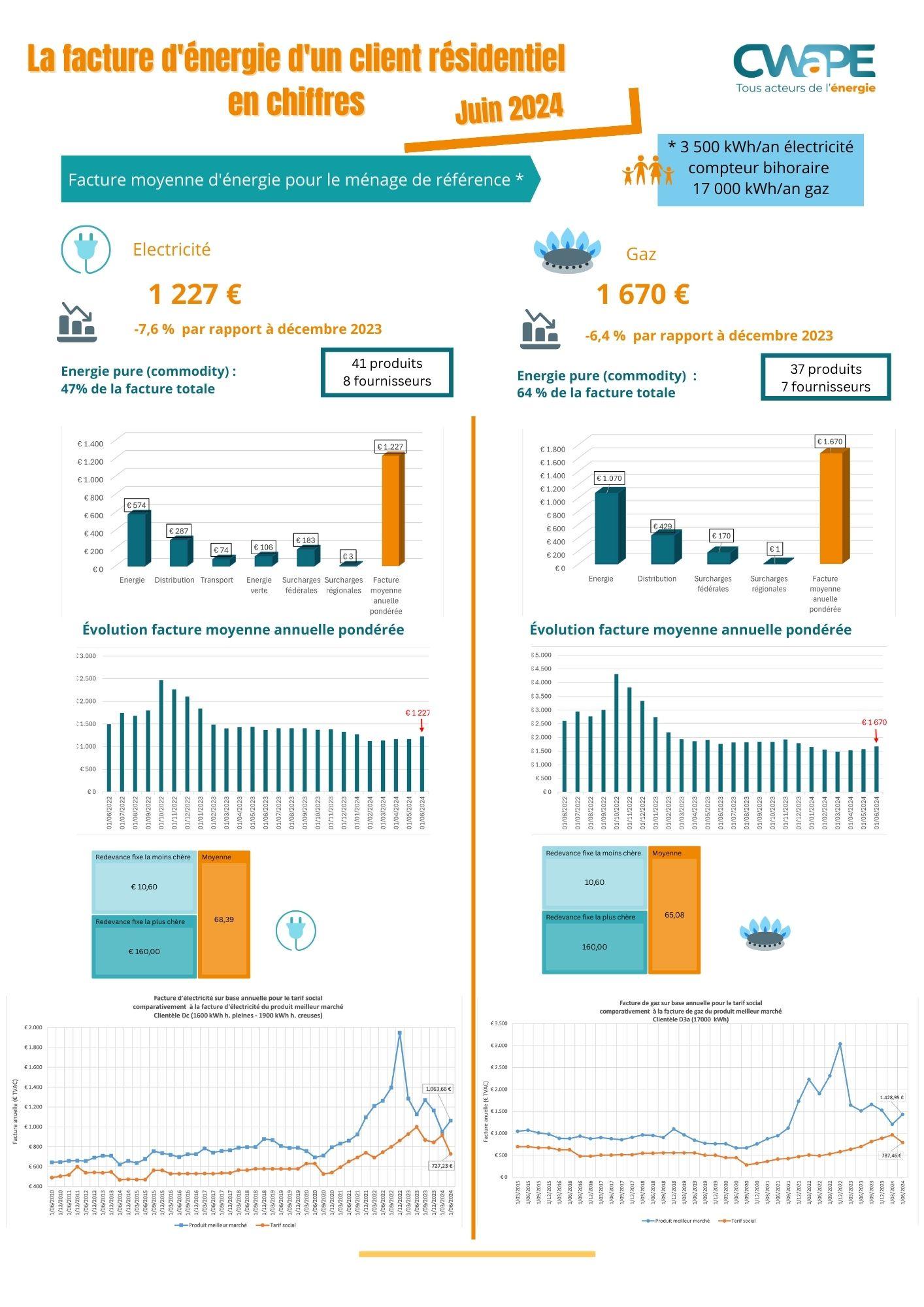 En juin 2024, la facture moyenne annuelle payée par le client résidentiel en Région wallonne[1] s’établit à 1227 € en électricité pour le client-type Dc et à 1670 € en gaz pour le client-type D3a.