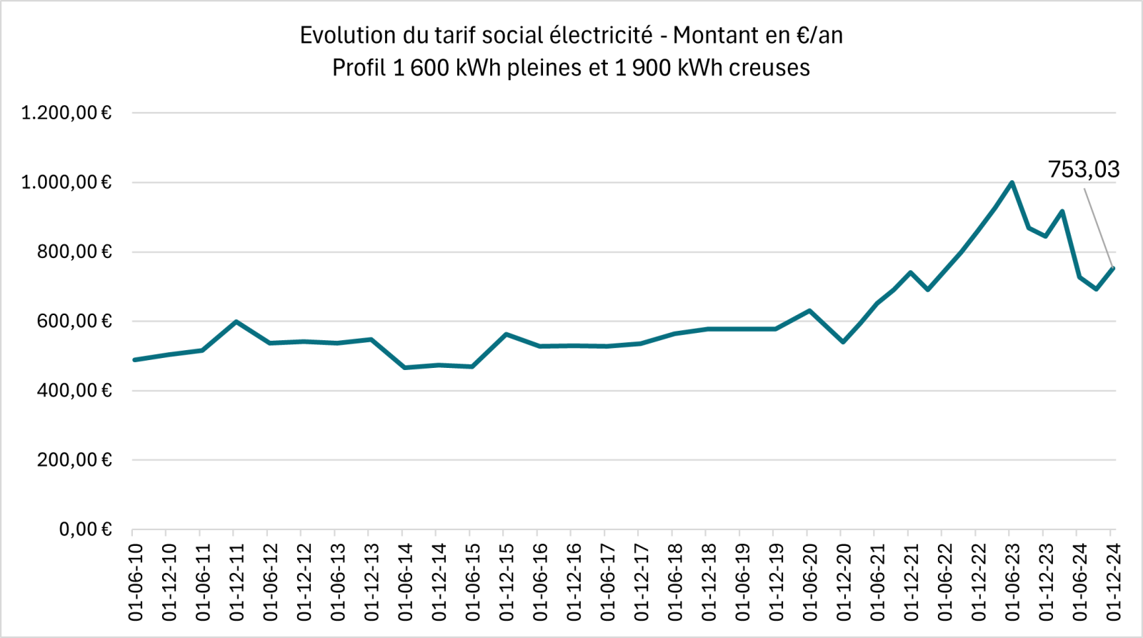 Ci-dessous, le graphique présente l'évolution du tarif social en électricité pour un profil de consommation Dc, soit 3500 kWh annuel, réparti en 1600 kWh h pleines et 1900 kWh h creuses.