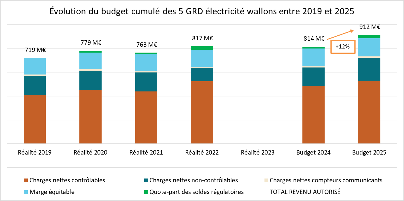 Le revenu autorisé de l’ensemble GRD wallons de l’année 2025 augmente de 12% par rapport à celui de l’année 2024. Cette augmentation provient notamment de l’indexation des coûts des GRD et de l’augmentation de leurs coûts d’achat d’électricité. Les décisions d’approbation des revenus autorisés électricité 2025 reprennent les informations détaillées pour chaque GRD.