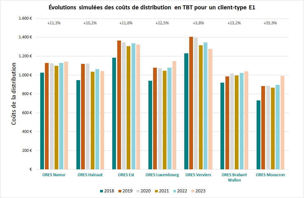 La moyenne pondérée des coûts de distribution basse tension (pour le client-type résidentiel 3.500 kWh) en Région wallonne augmente de 14% par rapport à 2024. L’évolution des coûts de distribution entre 2024 et 2025 varie fortement d’un GRD à l’autre. Les évolutions tarifaires détaillées de chaque GRD sont visibles dans les décisions d’approbation des tarifs de distribution d’électricité 2025.