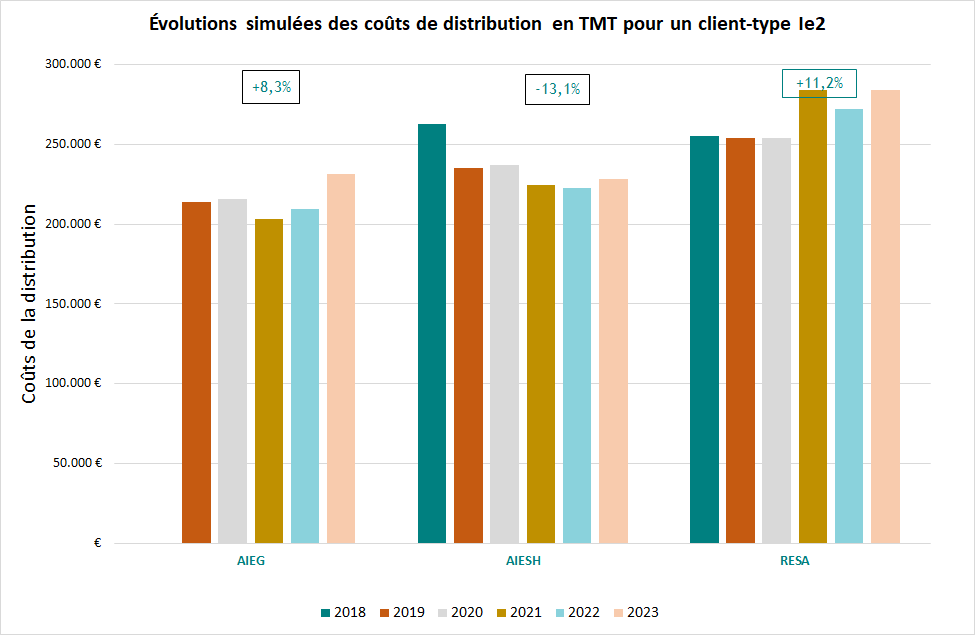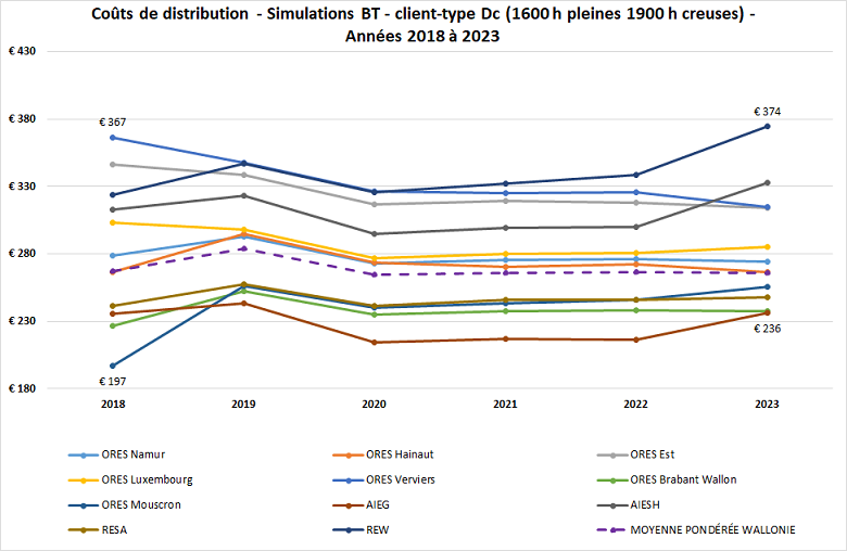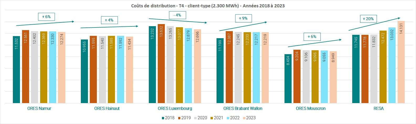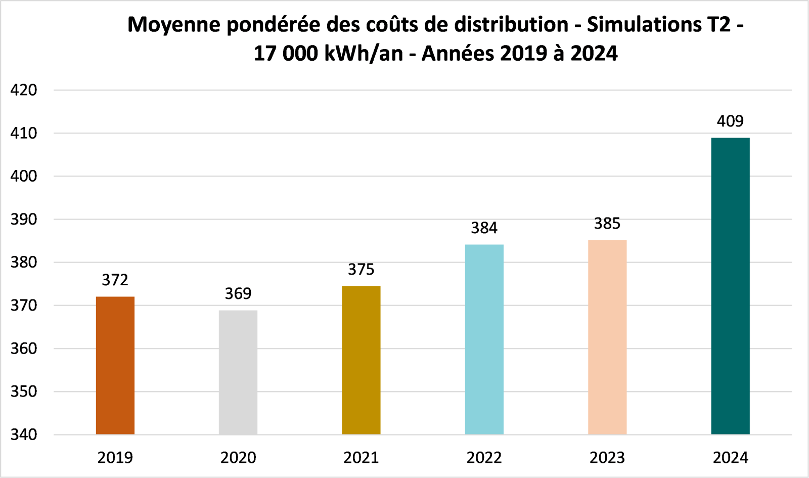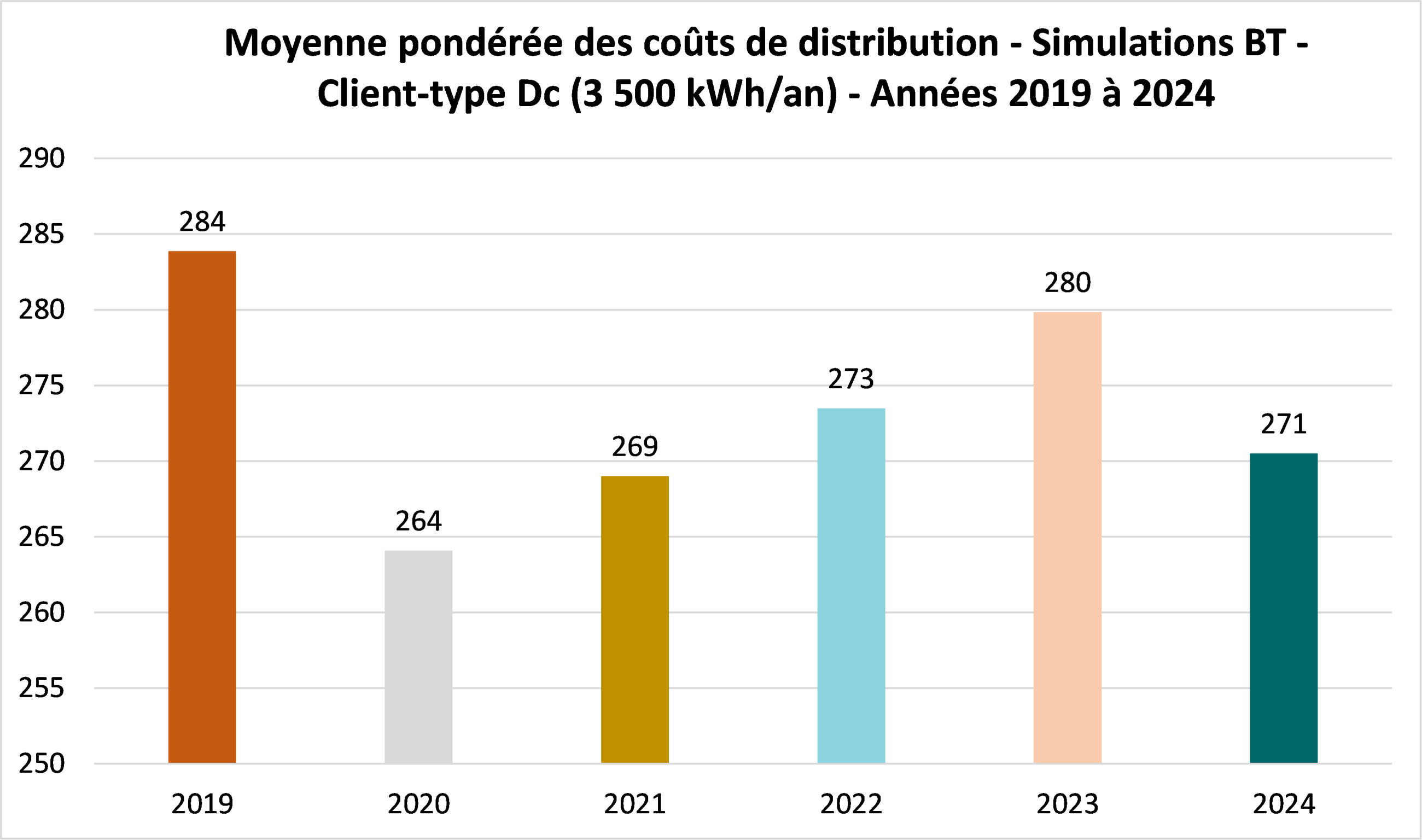 Le graphique ci-dessous présente la moyenne pondérée des coûts de distribution (client type T2) de 2020 à 2025.