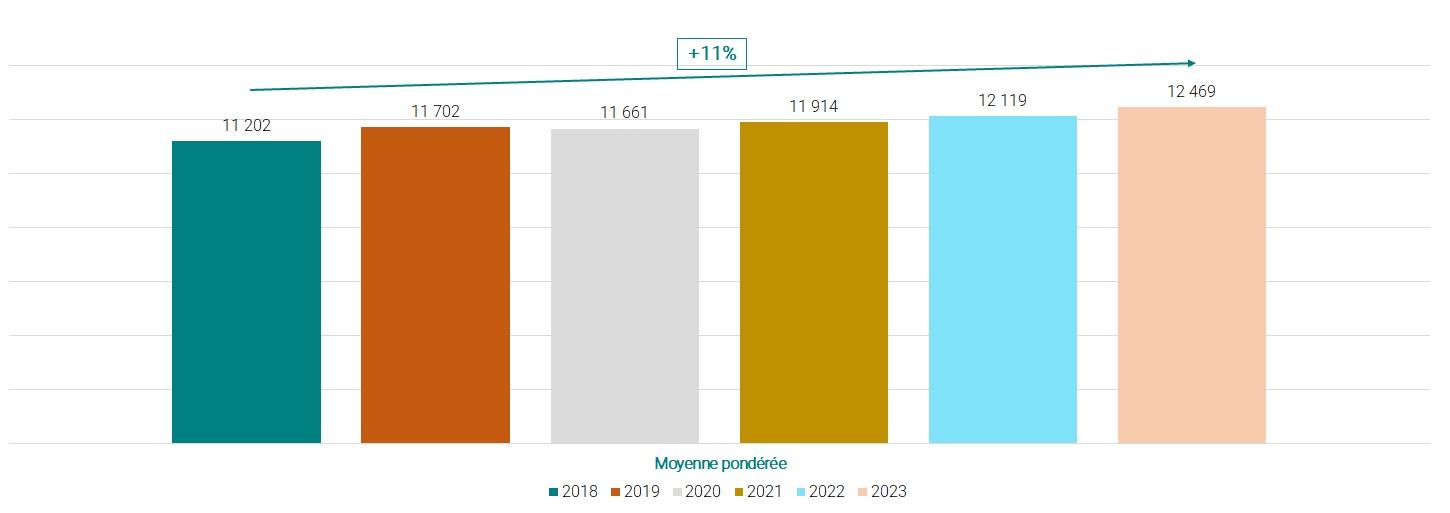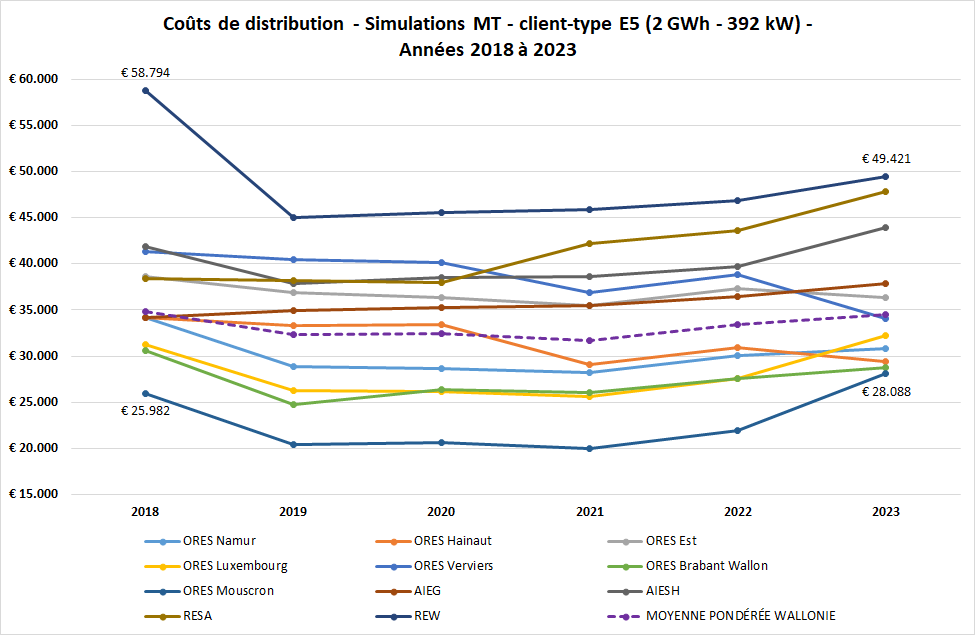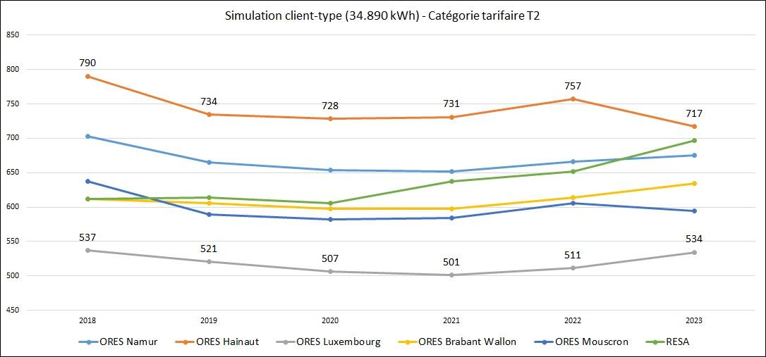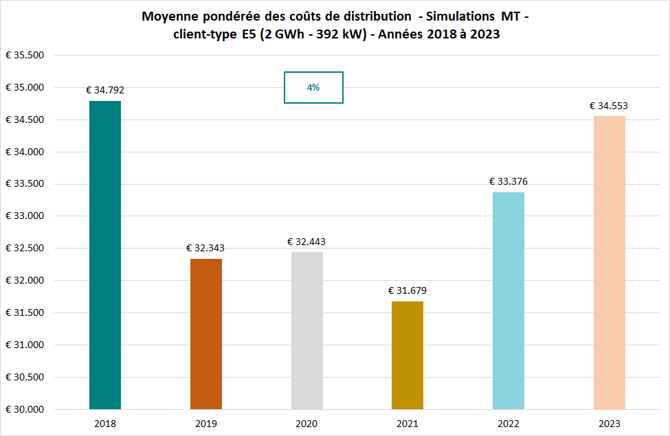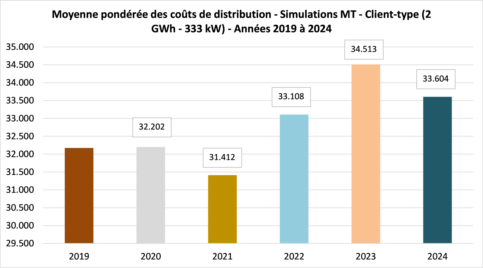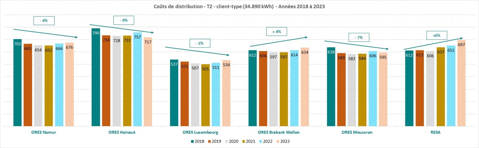 Le graphique ci-dessous présente la moyenne pondérée des coûts de distribution (client type T2) de 2020 à 2025.