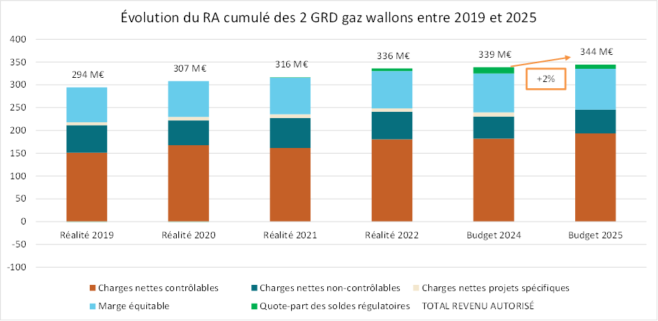 Le revenu autorisé global des GRD gaz wallons, pour l’année 2025, est 2% supérieur à celui de l’année 2024. Cette augmentation provient notamment de l’indexation des coûts des GRD. Les variations détaillées du revenu autorisé de chaque GRD se trouvent dans les décisions d’approbation des revenus autorisés gaz 2025-2029.