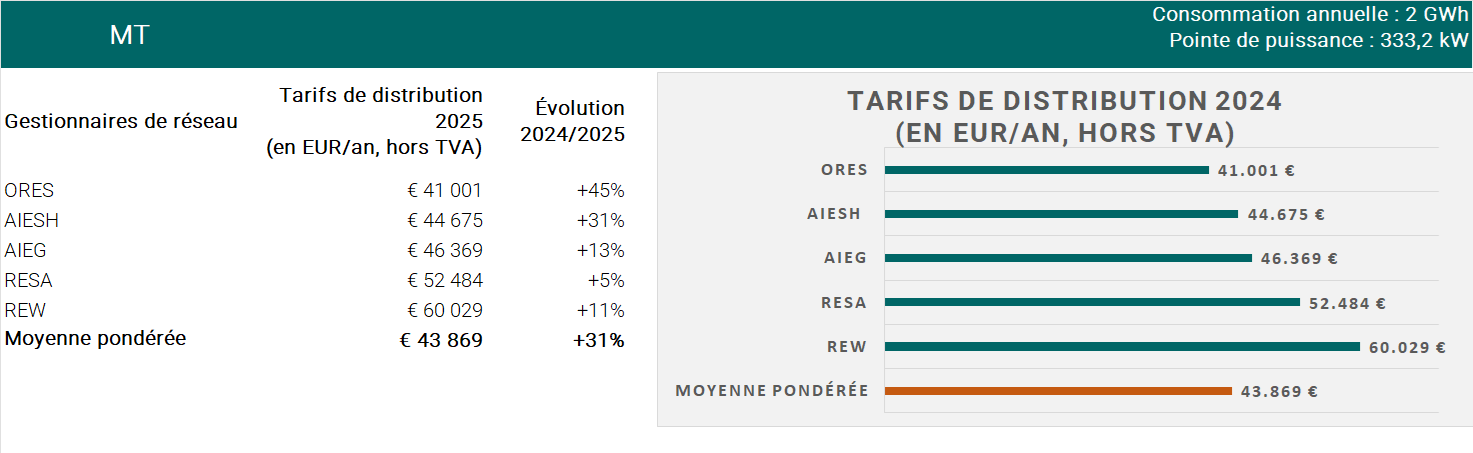 La moyenne pondérée des coûts de distribution basse tension (pour le client-type 2 GWh – 333 kW) en Région wallonne augmente de 31% par rapport à 2024. L’évolution des coûts de distribution entre 2024 et 2025 varie fortement d’un GRD à l’autre. Les évolutions tarifaires détaillées de chaque GRD se trouvent dans les décisions d’approbation des tarifs de distribution d’électricité 2025.