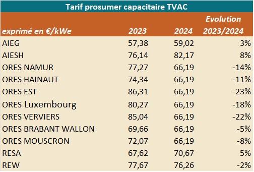 Le tarif prosumer capacitaire (facturé aux prosumers qui ne disposent pas d’un compteur communicant) connait des évolutions différentes d’un GRD à l’autre entre 2024 et 2025. Le fait que le tarif prosumer présente une hausse proportionnellement plus importante que la hausse du seul tarif de distribution provient du fait que le tarif de transport (inclus dans le tarif prosumer) augmente fortement entre 2024 et 2025.