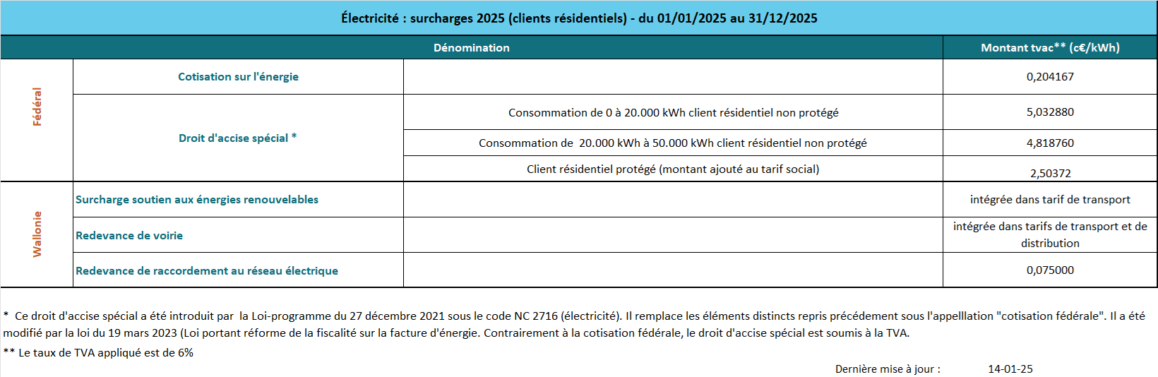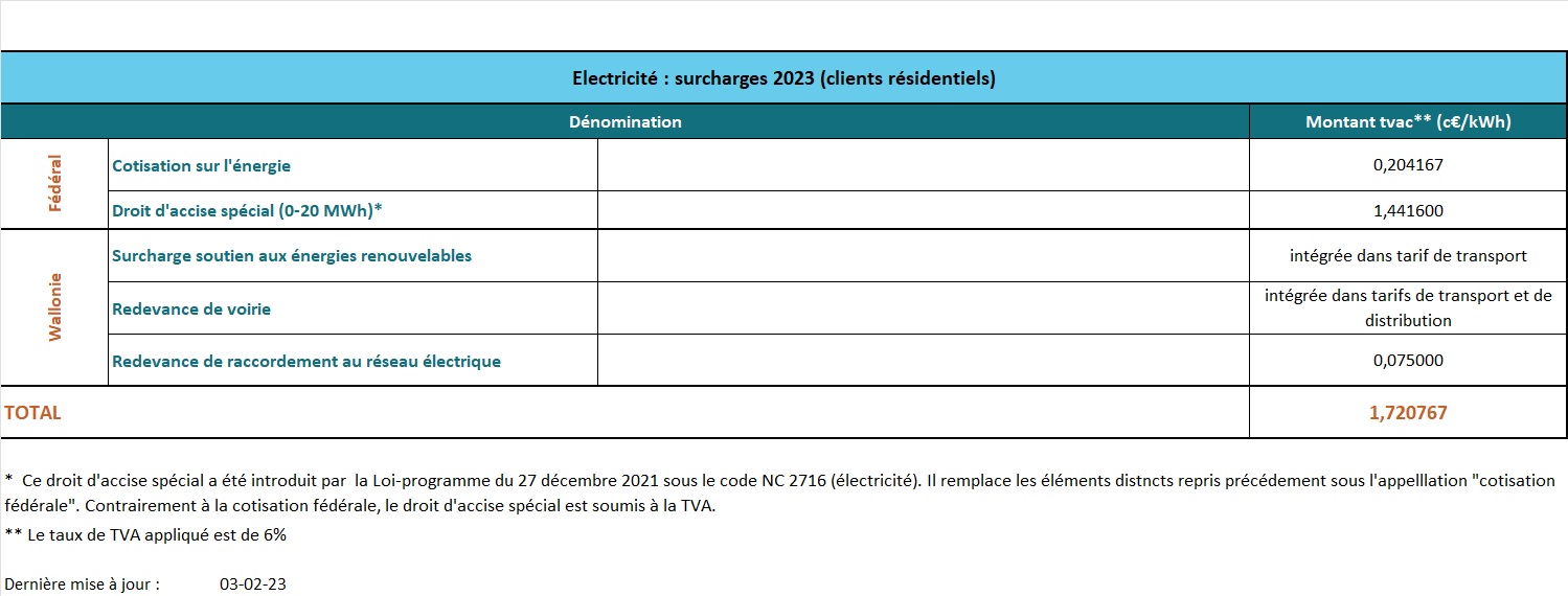 • Depuis le 01/01/2022, le droit d'accise spécial, regroupant les éléments suivants : la cotisation fédérale (Frais de fonctionnement CREG, dénucléarisation, OSP (CPAS), clients protégés, Kyoto) et les surcharges intégrées dans les tarifs de transport (surcharge raccordement parc éolien offshore et surcharge certificats verts offshore et surcharge "financement des réserves stratégiques").