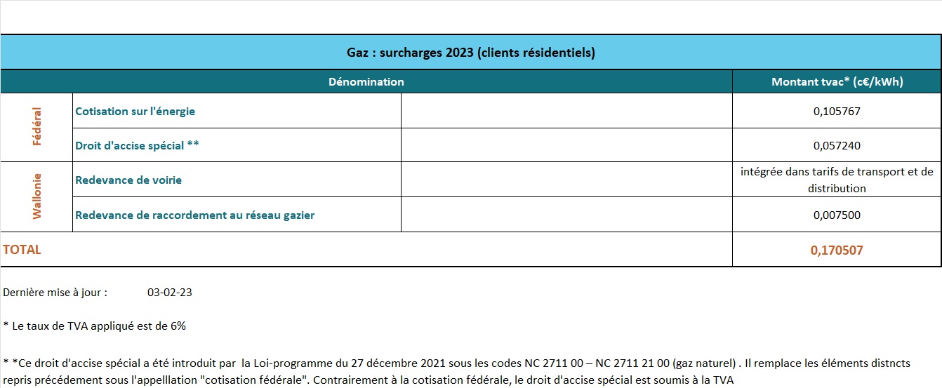 • La TVA (généralement 21%, est passé à 6% pour l'électricité en mars 2022, et à 6% pour le gaz depuis avril 2022) ; Voir la FAQ sur les modifications de la TVA en 2022.