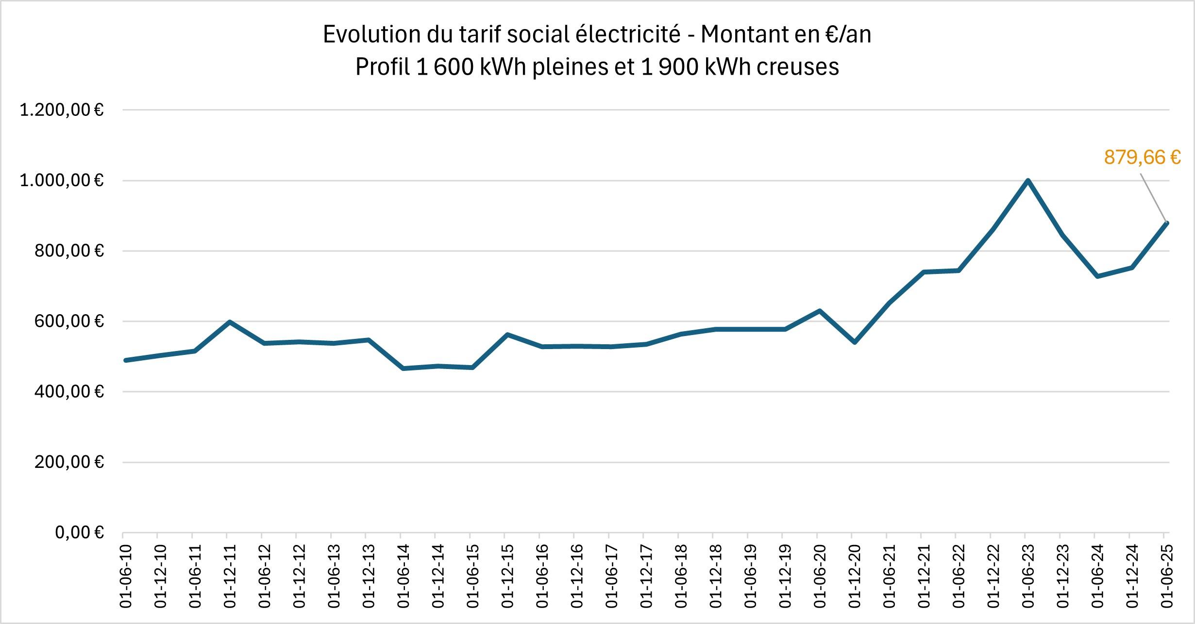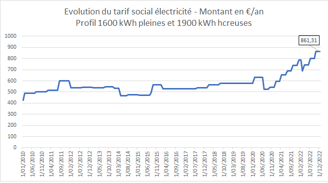 Ci-dessous, le graphique présente l'évolution du tarif social en électricité pour un profil de consommation Dc, soit 3500 kWh annuel, réparti en 1600 kWh h pleines et 1900 kWh h creuses.