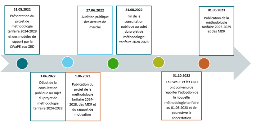La méthodologie tarifaire 2024-2028 devait initialement être publiée le 1er novembre 2022 mais le 30 octobre 2022, la CWaPE et les GRD ont convenu de reporter au 1er juin 2023 l’adoption de la méthodologie tarifaire 2024-2028 et de modifier la période régulatoire de cette méthodologie tarifaire à 2025-2029.