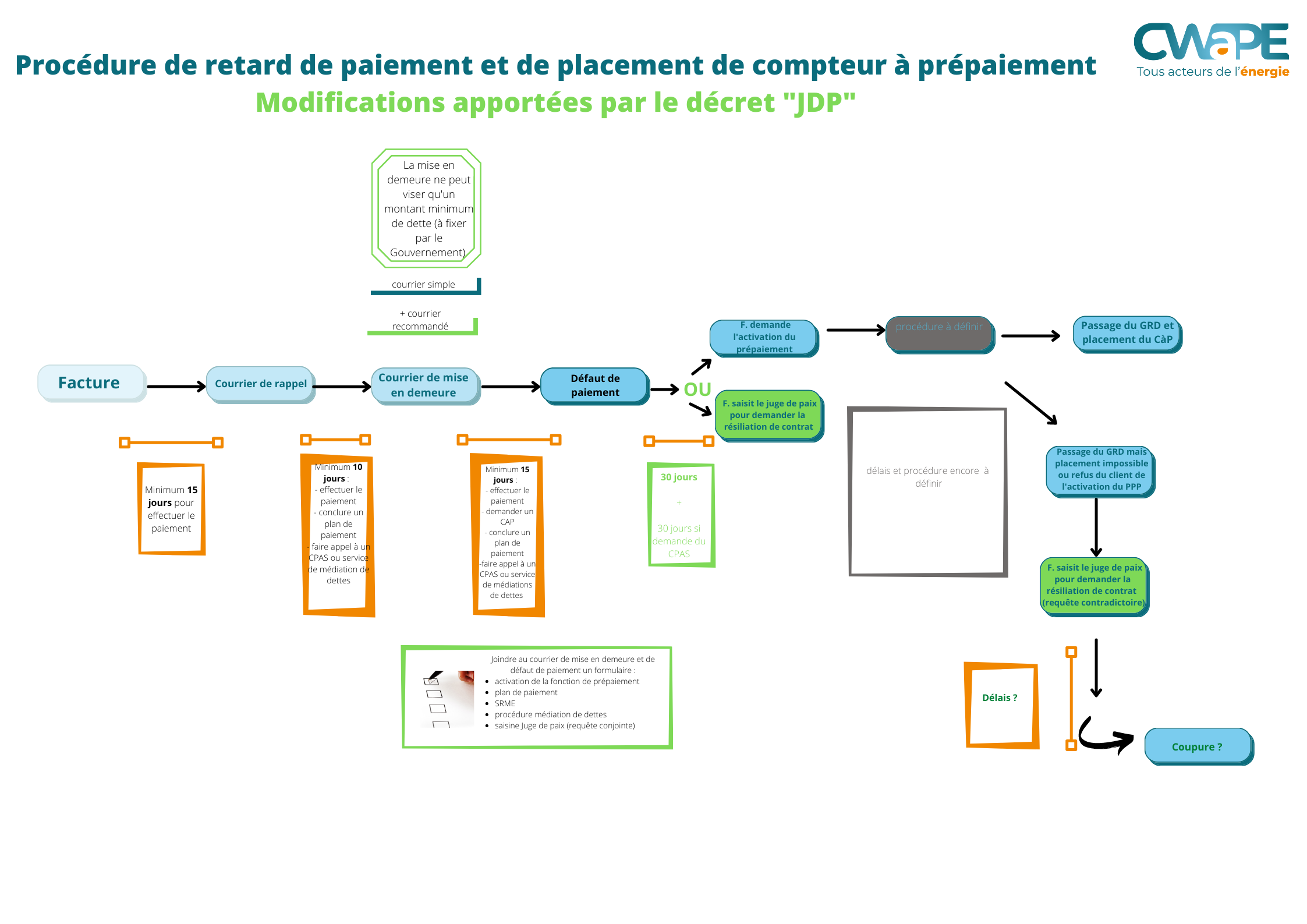 A partir du 1er janvier 2023, en cas de non-paiement des factures d’énergie d’un client résidentiel wallon, une procédure bien spécifique est prévue imposant aux fournisseurs d’énergie de respecter les étapes suivantes (les éléments repris en vert sont les modifications introduites par les décrets juge de paix à partir du 1er janvier 2023) :