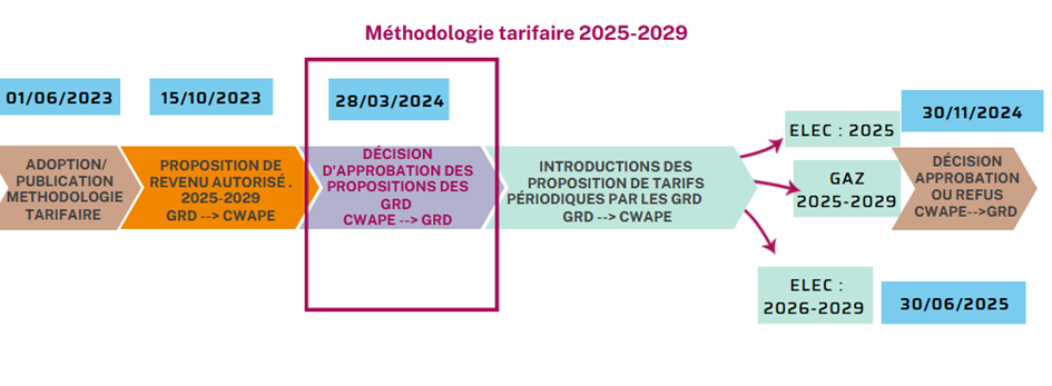 Le 1er juin 2023, la CWaPE a adopté la méthodologie tarifaire 2025-2029 qui comprend les règles permettant aux GRD de calculer leurs budgets et les tarifs de distribution des années 2025-2029 (uniquement 2025 pour l’électricité).